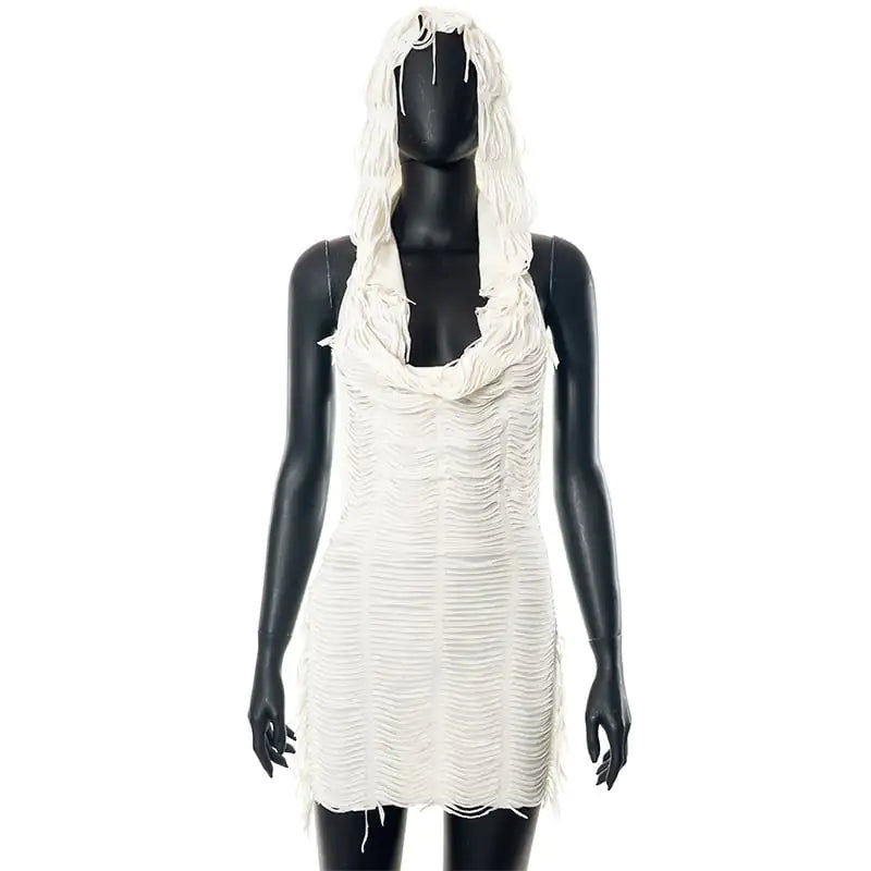 Whether you're dressing up for a casual outing or heading to a relaxed gathering, this short dress is perfect for any occasion. The sleeveless design allows for breathability and ease of movement, while the playful hood and tassels add a unique touch to your look.