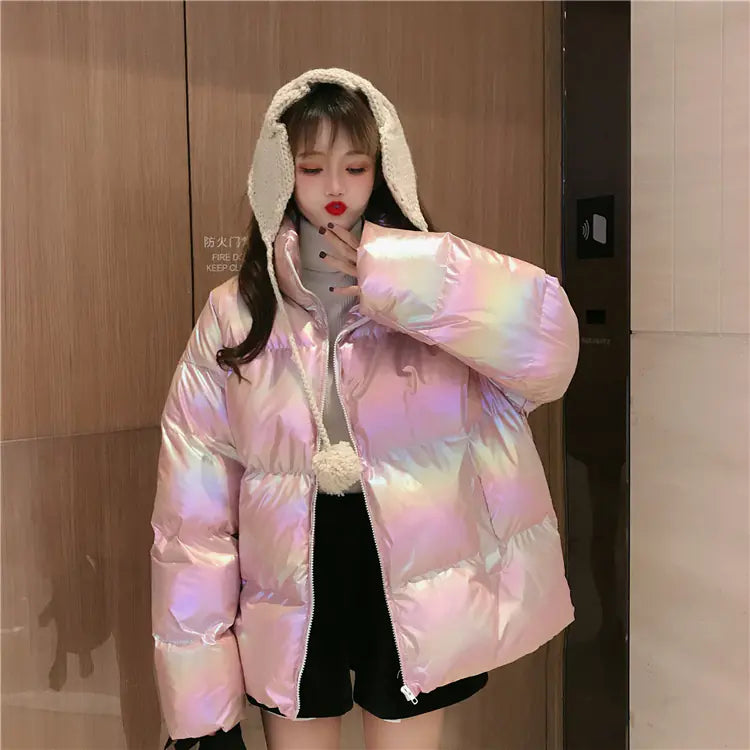 With its short length and long sleeves, this jacket is perfect for layering over your favorite outfits. The loose fit provides ample room for movement, while the hooded design adds an extra touch of coziness. Plus, its unique colorful reflective surface is sure to turn heads, making you the center of attention wherever you go.